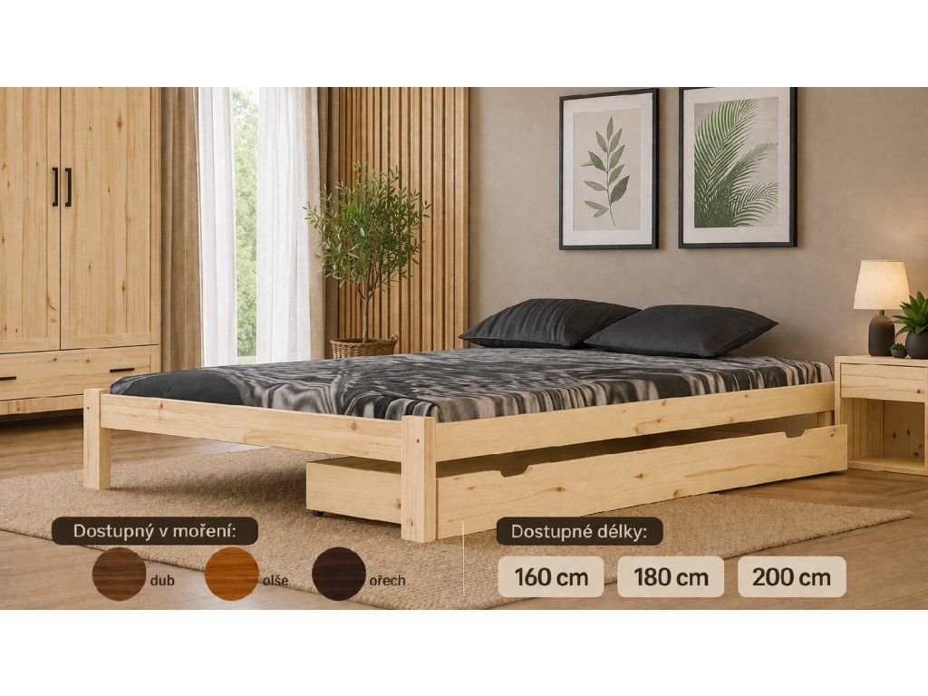 Přírodní borovicové dřevo navíc dodává interiéru útulný a nadčasový charakter, který se hodí do moderních i klasických ložnic. Šuplík je navíc dostupný i v dalších mořeních – dub, olše a ořech, takže jej snadno sladíte s ostatním nábytkem.